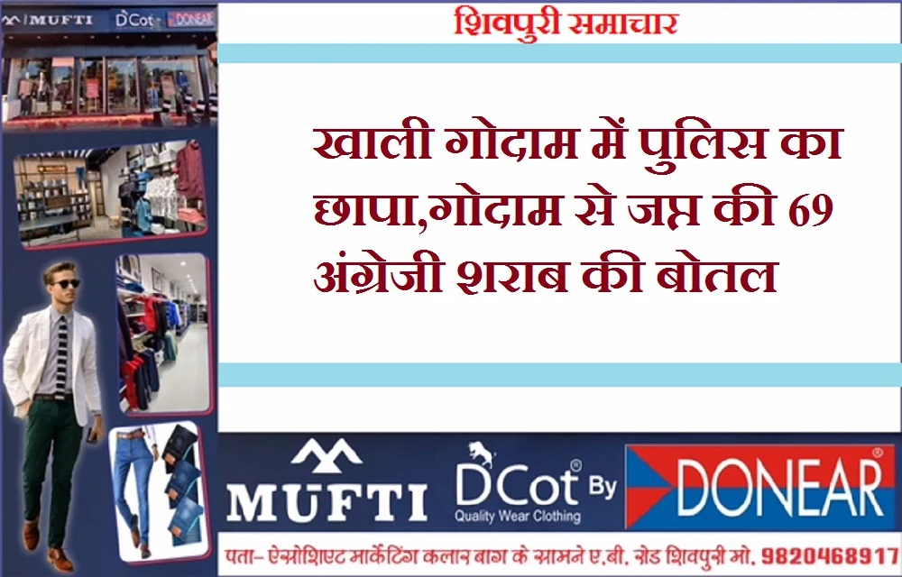 शिवपुरी। खबर जिले के देहात थाना क्षेत्र के बरौदी में खाली पड़े गोदाम में दबिश देकर पुलिस ने अंग्रेजी शराब की 96 बोतलें बरामद की। जब्त की शराब की कीमत 60 हजार रुपये आंकी गई है।