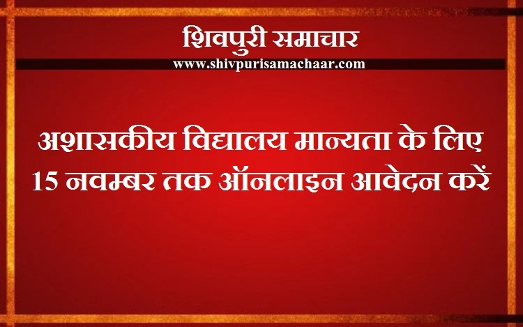 शिवपुरी। अशासकीय हाईस्कूल एवं हायर सेकेण्ड्री विद्यालयों की नवीन मान्यता वर्ष 2022-23 के लिए ऑनलाइन आवेदन किये जाने है, इसके लिए एमपी ऑनलाइन पोर्टल पर सुविधा प्रारंभ कर दी गई है। जिन अशासकीय संस्थाओं को नवीन मान्यता वर्ष 2022-23 के लिए आवेदन किये जाने है, वे संस्थाए एम.पी.ऑनलाइन पोर्टल के माध्यम से 15 नवम्बर 2021 तक ऑनलाइन आवेदन कर सकते है।